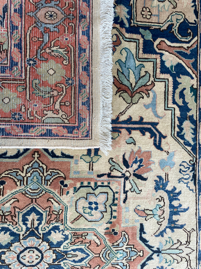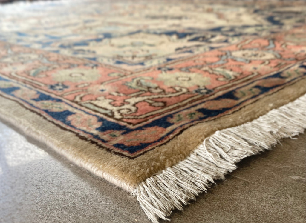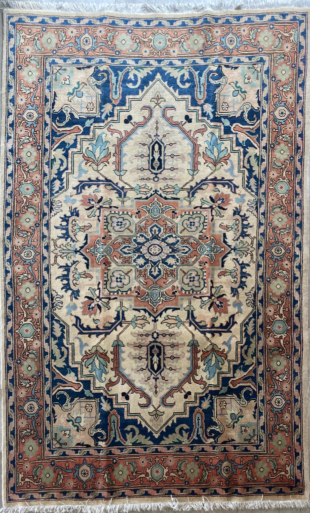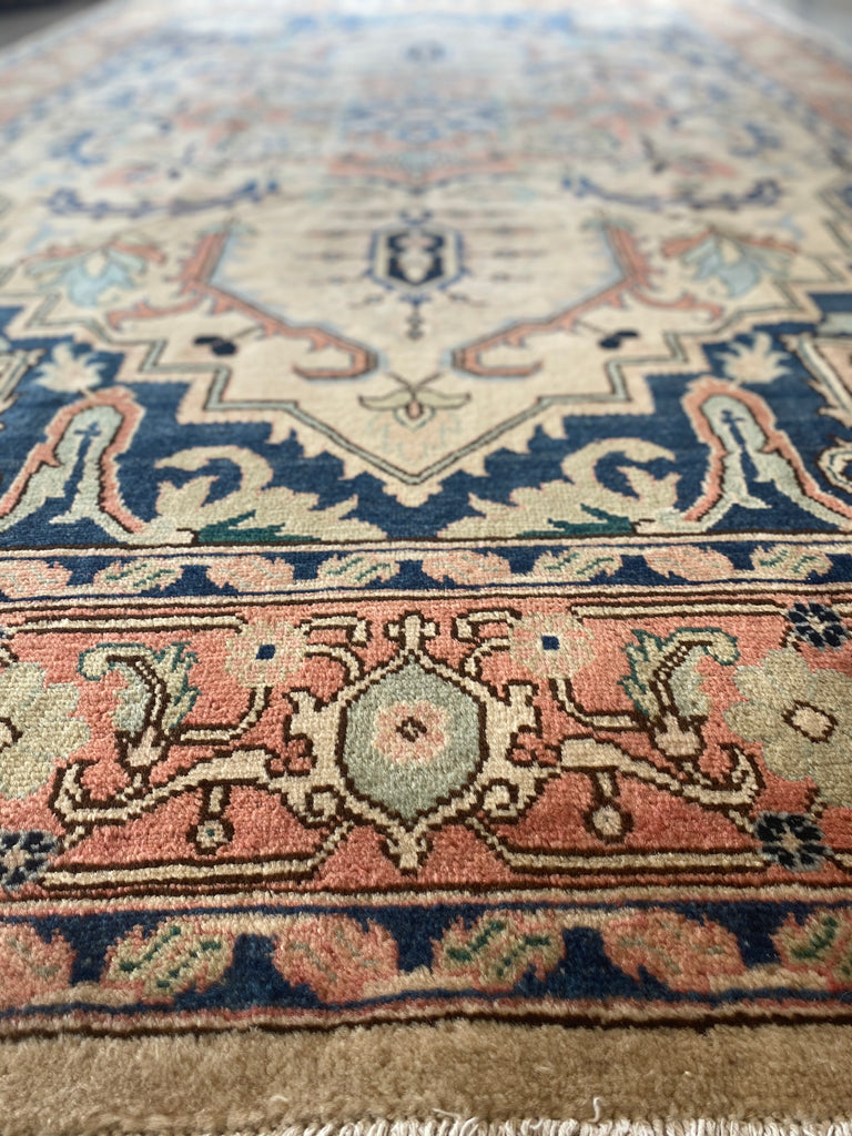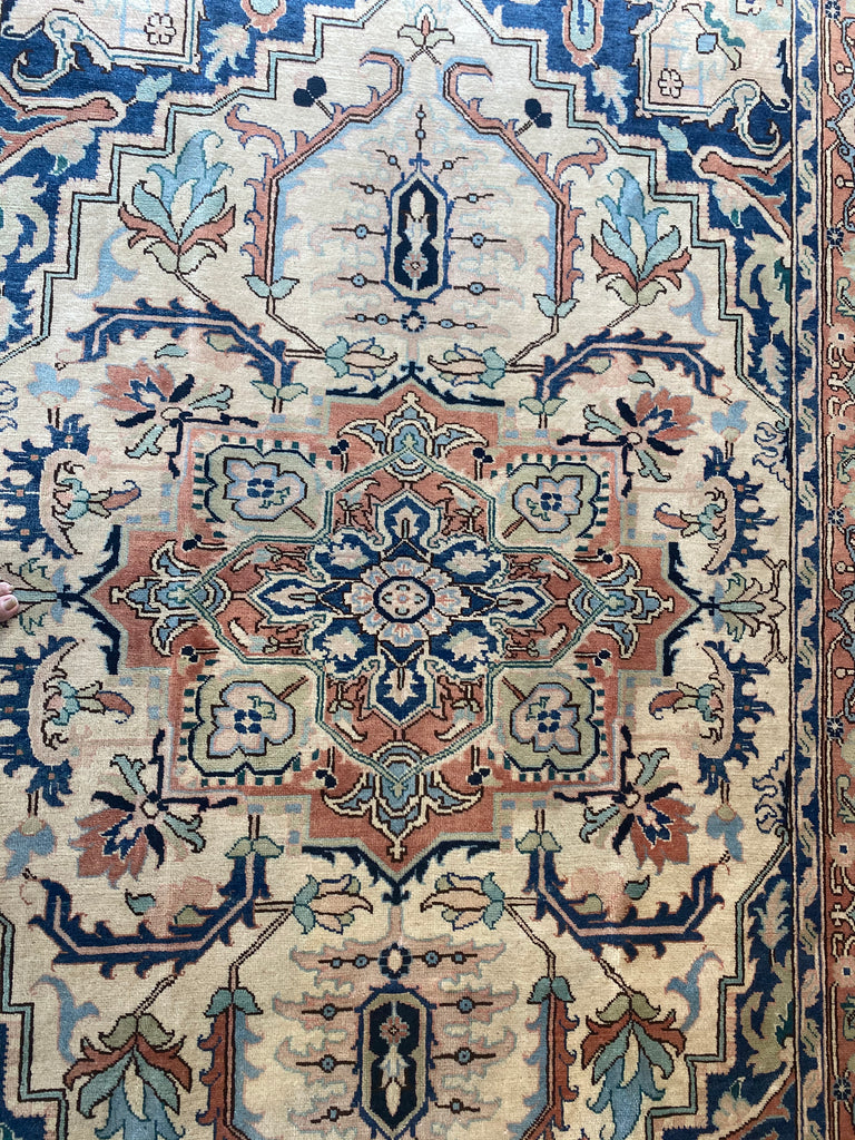 The weaver has seamlessly blended contrasting colours to create a beautiful tapestry. The rug is dominated with a large central medallion and framed with a rust orange colour. This is a beautifully woollen handwoven rug that can be used as a contemporary or classical rug.